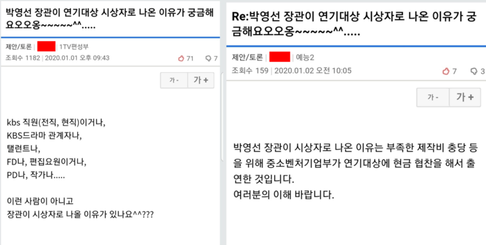 글을 올린 KBS의 한 직원은 “KBS 전·현직, 드라마 관계자, 탤런트, FD(조연출·무대 감독), 편집요원, PD, 작가 이런 사람이 아니고 장관이 시상자로 나올 이유가 있느냐”고 물었다.