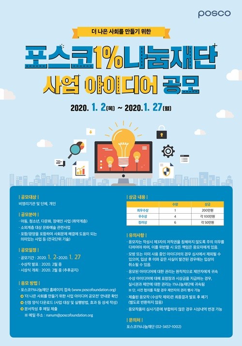 한편, 포스코1%나눔재단은 외부 개방형 협업을 통해 다양한 사업을 추가 발굴하기 위해 이달 27일까지 사업 아이디어 공모전을 진행한다. 단체나 개인 모두 응모 가능하며, 상금은 최우수상 1팀 200만원, 우수상 4팀 각 100만원, 장려상 6팀 각 50만원이다.