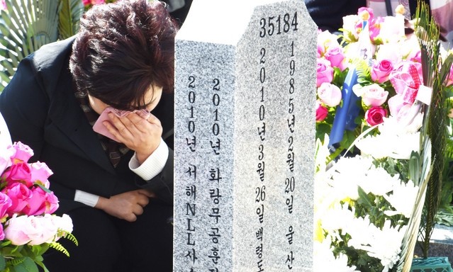 ▲ 2019년 3월 22일 제 4회 서해수호의 날 대전 유성구 국립대전현충원 천안함 46용사 묘역을 찾은 유가족들이 슬픔에 잠겨 있다.