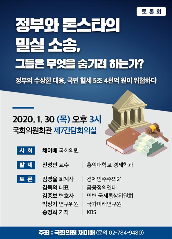 국회 법제사법위원회 소속 바른미래당 채이배 의원은 30일 오후 3시 국회의원회관 제7간담회의실에서 <정부와 론스타의 밀실 소송, 그들은 무엇을 숨기려 하는가? : 정부의 수상한 대응, 국민 혈세 5조 4천억 원이 위험하다>를 주제로 토론회를 개최한다.