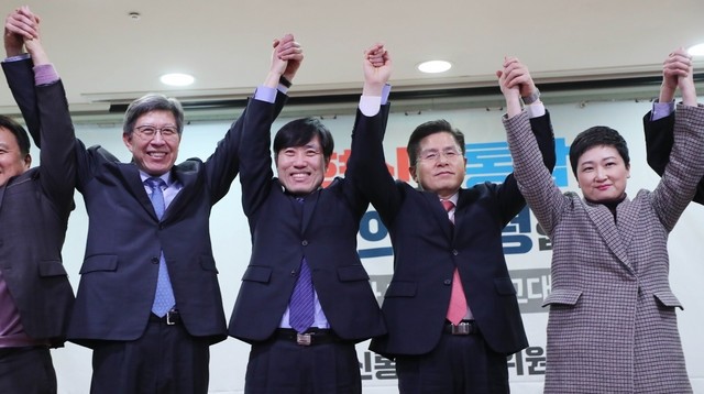 ▲ 황교안 자유한국당 대표와 박형준 혁신통합추진위원회 위원장 등이 31일 서울 여의도 국회 의원회관에서 열린 혁신통합추진위원회 제1차 대국민보고대회에서 손을 잡고 기념촬영을 하고 있다. 사진은 박형준(왼쪽부터) 혁통위원장, 하태경 새로운보수당 책임대표, 황교안 자유한국당 대표, 이언주 미래를 향한 전진 4.0(전진당) 대표.