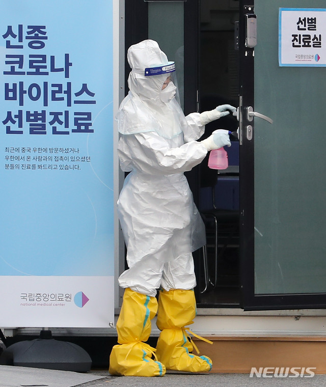 ▲ 우한 교민 환자가 신종 코로나 바이러스(우한 폐렴) 확진 받은 2일 오후 서울 중구 국립중앙의료원에 설치된 선별진료소에서 의료진이 손잡이 소독을 하고 있다. 2020.02.02. (사진=뉴시스)