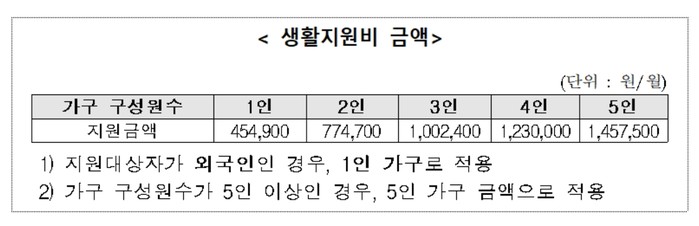 가구 구성원 수가 1인일 때는 45만4900원, 2인 77만4700원, 3인 100만2400원이다. 5인 이상인 경우 145만7500원을 지급하게 된다.