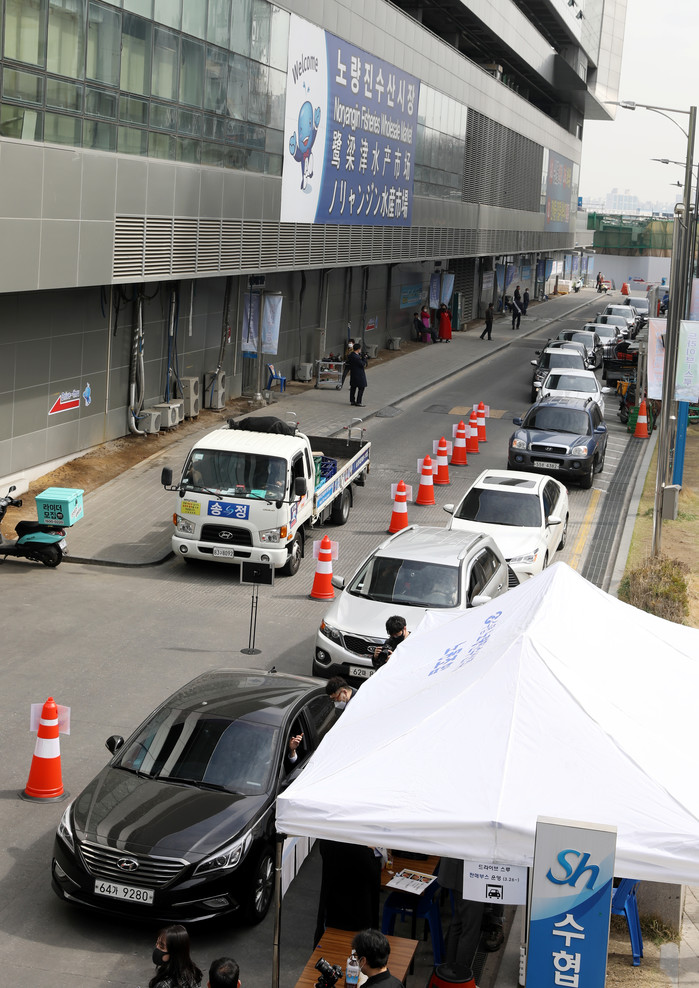 ▲ 서울 동작구 노량진수산시장에 설치된 드라이브 스루 판매 부스에서 차량들이 수산물을 구입하기 위해 대기하고 있다.