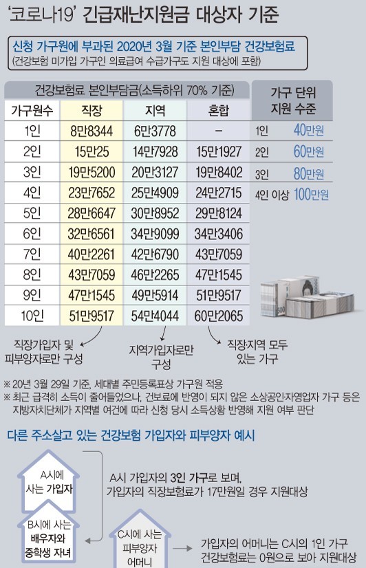 긴급재난지원금은 가구 단위로 지급된다. 지급단위는 올해 3월 29일 기준 주민등록법에 따른 세대별 주민등록표상 가구원을 기준으로 한다. 주민등록법상 거주자 중 세대별 주민등록표에 함께 등재된 사람을 동일 가구로 본다. 다만 건강보험자의 피부양자로 등록된 배우자와 자녀는 주소지를 달리하더라도 동일가구로 본다.