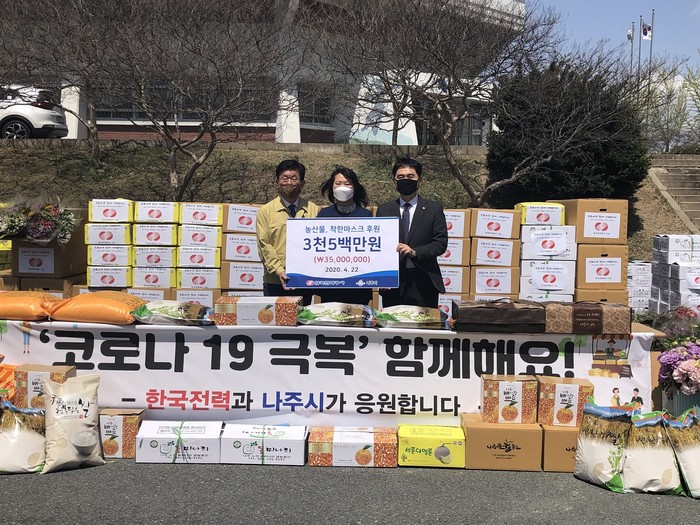 한전은 이날 코로나19로 판로가 막힌 나주시 소재 농가에서 재배한 농·특산물 이천만원 어치를 구매해 복지기관 35곳에 전달하는 ‘농산물 후원 전달식’을 가졌다.