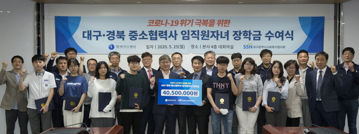 한국가스공사는 25일 대구 본사에서 코로나19 위기 극복을 위한 ‘대구·경북지역 중소협력사 임직원 자녀 장학금 수여식’을 가졌다고 밝혔다.