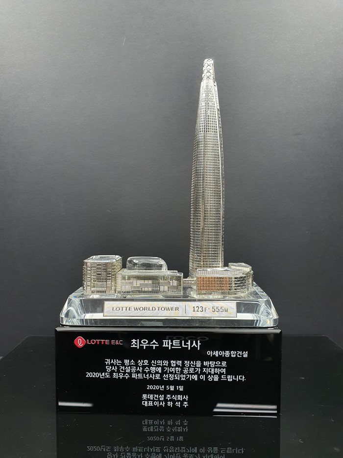 이번 파트너사 정기 평가를 통해서 롯데건설은 아세아종합건설 등 최우수 파트너사 3개사에 각 3000만 원의 포상과 상패를 지급했다. 또한 안전한 시공 및 건설 공헌에 기여한 두송건설(주)과 (주)우진아이엔에스를 안전 최우수 및 우수 파트너사로 선정하여 안전 최우수사에는 포상금 2000만 원과 상패를, 안전 우수사에는 포상금 1000만원과 상패를 지급한다.