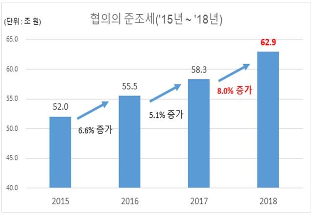 ‘협의의 준조세’는 조세 외에 전 국민이 강제적으로 져야 하는 모든 부담을 뜻하는 ‘광의의 준조세’ 중 기업이 대가 없이 추가로 내는 금액을 일컫는다. 사회보험 중 기업 부담분과 비자발적 기부금이 이에 해당한다. 최근 협의의 준조세는 계속 증가하는 추세다. 2015년 52조원 수준이던 협의의 준조세는 매년 늘어나 2018년에는 약 8.0%(4조6,000억원) 증가하며 최고치를 찍었다.