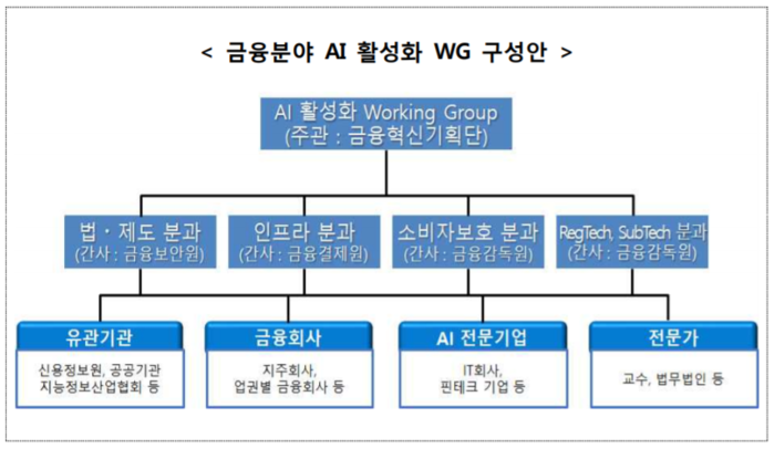 금융위 관계자는 “금융분야 AI 활성화 워킹그룹을 운영해 연말까지 방안을 마련할 것”이라며 “이달부터 오는 11월까지 워킹그룹 운영과 함께 금융분야 AI 활성화 관련 정책과제 발굴을 위한 정책연구용역도 병행할 예정”이라고 말했다.