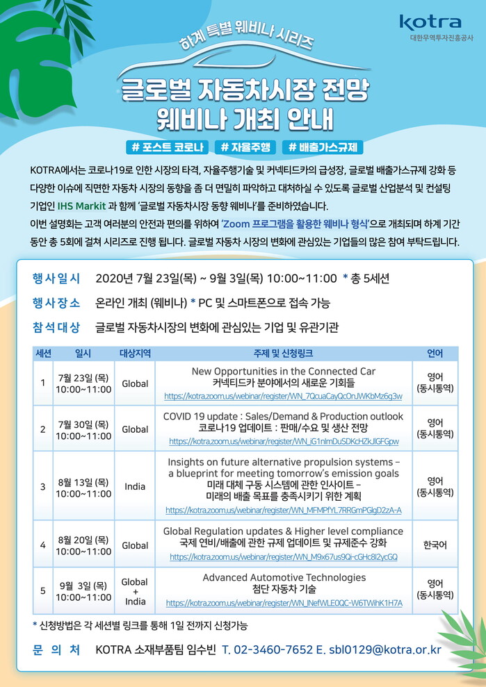 총 5회로 구성된 웹세미나는 ▲커넥티드카 분야의 새로운 기회(7월 23일) ▲코로나19 업데이트: 수요·생산 전망(7월 30일) ▲첨단 자동차기술(9월 3일) 등 다양한 주제를 다룬다. 아이에이치에스마킷의 글로벌 자동차시장 전문가 13인이 연사로 나선다.