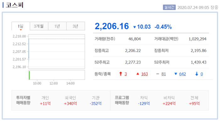 이날 오전 9시 5분 현재 코스피지수는 전 거래일보다 10.03포인트(0.45%) 내린 2206.16을 기록하고 있다.