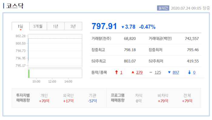 코스닥시장에서 개인과 외국인은 각각 70억원, 17억원을 순매수했다. 반면 기관은 57억원을 순매도했다.
