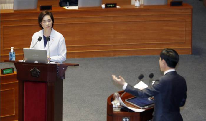 ▲ 유은혜 사회부총리 겸 교육부 장관이 24일 서울 여의도 국회에서 열린 본회의 교육·사회·문화 대정부질문에서 하태경 더불어민주당 의원 질의를 듣고 있다. (사진=뉴시스)