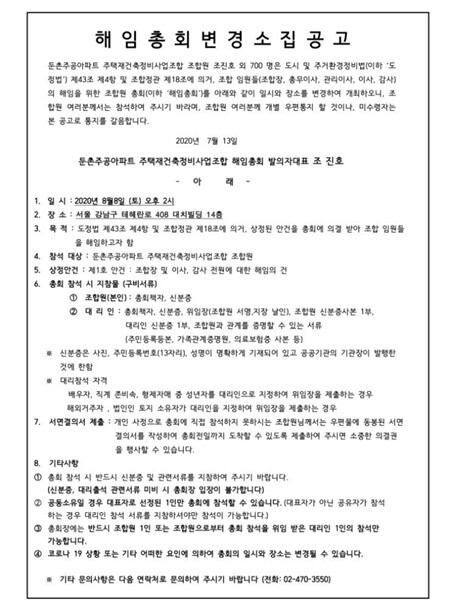 이어 “일부 조합원들은 내홍으로 인해 둔촌주공 일반 분양 일정이 장기간 포류할 것을 우려하고 있다”고 덧붙였다.