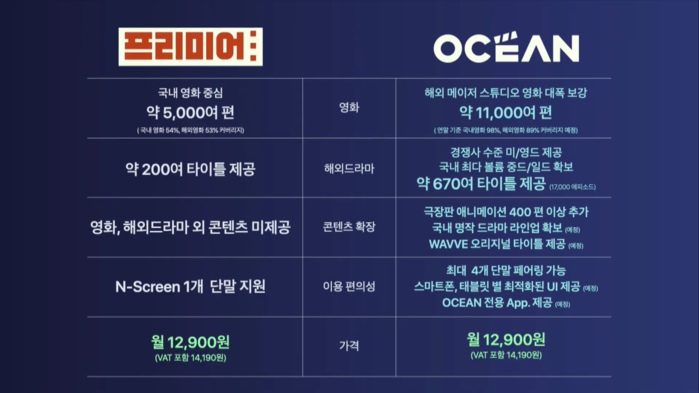 SK브로드밴드가 이전에 제공하던 월정액 상품인 ‘프리미어’는 B tv가 보유한 한국영화 54%, 해외영화 53%의 총 5000여 편의 콘텐츠를 제공했었다. 그러나 OCEAN은 B tv가 보유한 영화 중 한국영화 97%, 해외영화 87%에 해당하는 1만1000 편을 감상할 수 있다. 가격은 기존의 프리미어와 동일하다.
