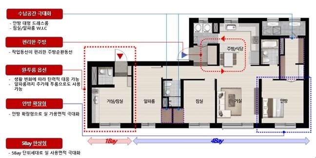 라이프 스타일의 변화를 반영한 ‘FLEX 59’캥커루 하우스평면도 눈길을 끈다. FLEX 59 평면은 벽과 기둥의 골조를 최소화해 고객 취향에 따라 기존 3베이(침실1-거실-침실2 구성) 구조를 거실과 침실을 하나로 통합해 사용할 수 있다.