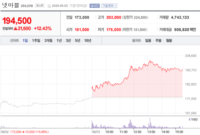 3일 유가증권시장에서 빅히트의 2대 주주인 넷마블(251270)은 전 거래일보다 12.43%(2만1500원) 오른 19만4500원에 거래를 마감했다. 장중 한때 16.76%(2만9000원) 뛴 20만2000원까지 올라 52주 신고가를 새로 쓰기도 했다. 넷마블은 빅히트의 지분 25.1%를 보유하고 있다.
