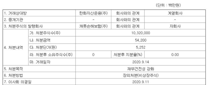 한화손보 측은 "이번 매각을 통해 자회사의 적자로 인한 연결손익 악화와 추가 자본금 투입의 부담에서 벗어나 손익구조를 개선하고, 재무건전성을 강화하고자 한다"고 밝혔다.
