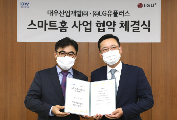▲  고재석 LG유플러스 홈영업담당(좌측)와 조재현 대우산업개발 상품외주담당 상무(우측)가 스마트홈 플랫폼 구축을 위한 업무협약 체결 후 기념촬영을 하고 있다. (사진=LG유플러스)
