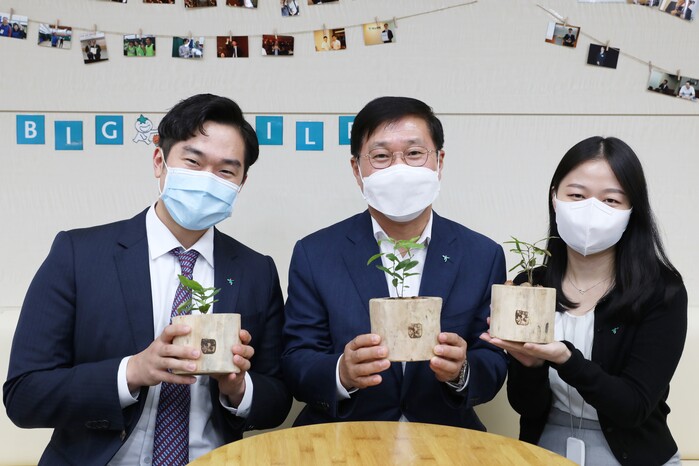 ‘비대면 숲 만들기’는 임직원들이 ‘집에서 씨앗을 키우는 통나무(이하 집씨통)’ 키트를 수령해 각자 집에서 도토리를 한뼘정도 크기의 묘목으로 키운 후, 노을공원의 ‘동물이 행복한 숲’ 에 보내는 언택트 사회공헌 활동이다.
