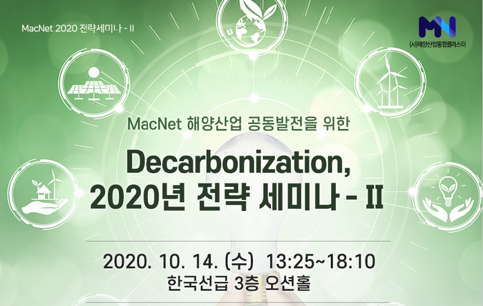 [팩트인뉴스=변윤재 기자] 해양산업통합클러스터(MacNet)는 오는 14일 오후 1시30분부터 ‘Decarbonization, 2020 전략세미나 - Ⅱ’를 온라인 개최한다고 7일 밝혔다.