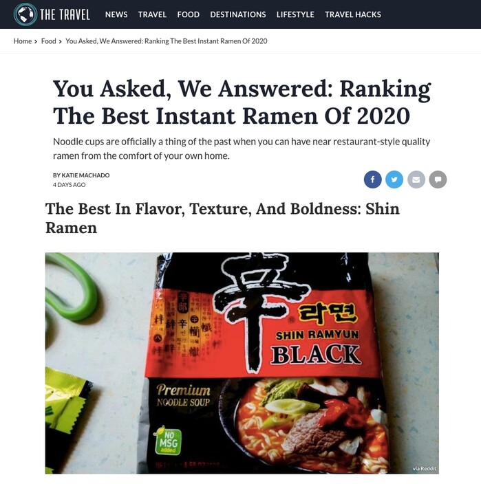 더 트래블은 지난 8일 ‘Ranking The Best Instant Ramen of 2020(2020년 최고의 라면)’을 발표하면서 농심 ‘신라면블랙’을 올해 최고의 라면 BEST4 중 하나로 선정했다.
