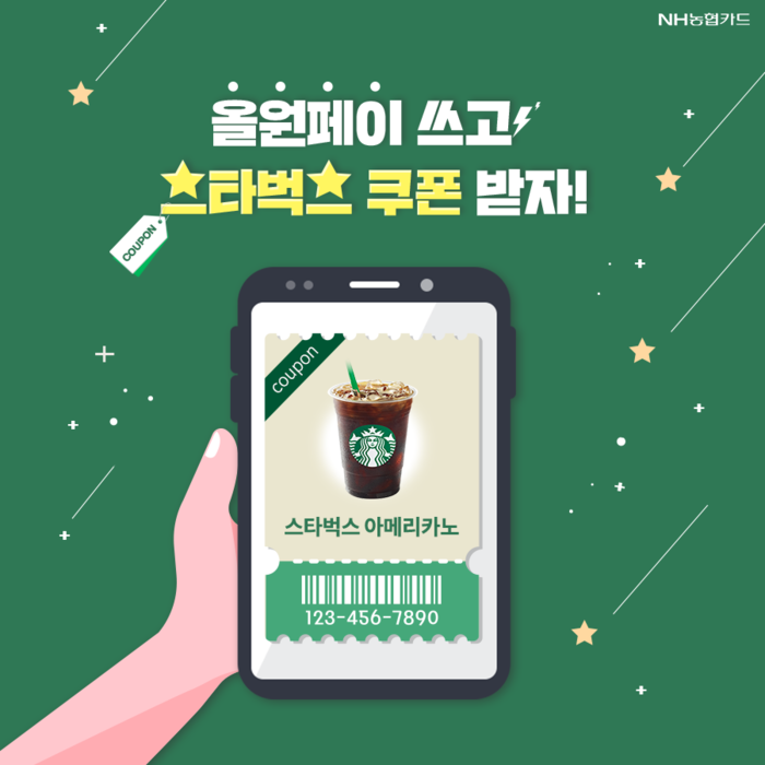 올원페이(NH앱카드)의 300만 회원 달성을 기념해 올원페이(NH앱카드) 오프라인 결제를 5회 이상 이용한 고객 중 10,000명을 추첨하여 스타벅스 아메리카노 모바일쿠폰을 제공하는 이벤트도 실시한다. 행사기간은 오는 31일까지다. 이벤트 참여를 위해서는 행사기간 내 이벤트 응모가 필수다.