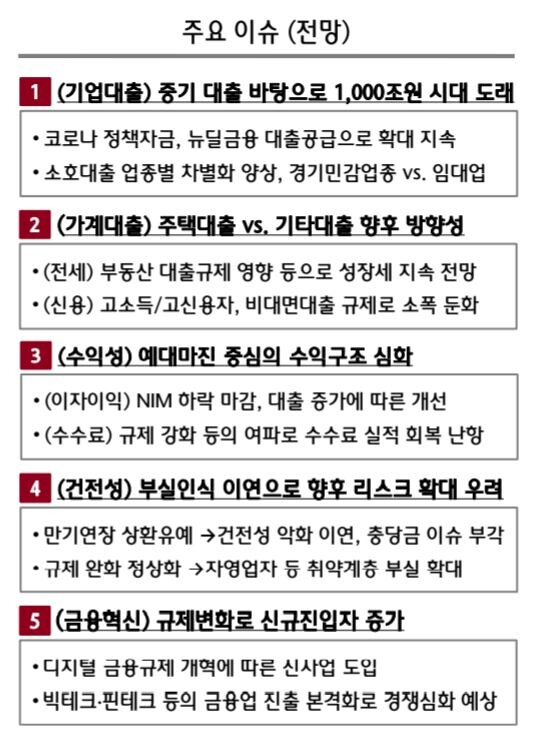 연구소는 코로나19 영향으로 이연된 리스크의 확산에 대비해야 한다고 강조했다. 빅테크 등 비금융회사의 금융업 진출도 활발해지고, 어느 때보다 치열한 새로운 경쟁관계가 펼쳐질 것으로 전망했다.