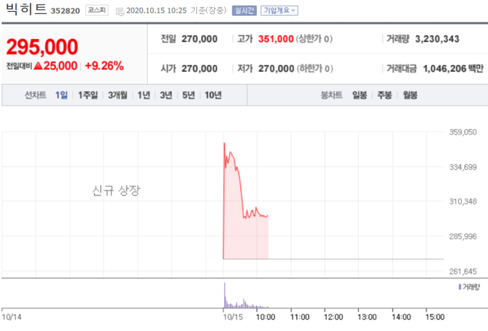 이날 오전 10시 25분 기준 빅히트는 시초가 대비 9.26%(2만5000원) 오른 29만5000원에 거래되고 있다. 이는 공모가 대비 119%(16만원) 상승한 것으로 상장 첫날 1주당 수익률을 의미한다.