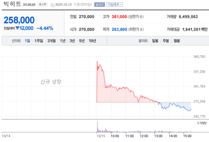 15일 유가증권시장에서 빅히트(352820)는 시초가(27만원) 대비 4.44%(1만2000원) 하락한 25만8000원에 거래를 마쳤다. 이는 공모가(13만5000원) 대비 91%(12만3000원) 상승한 것으로 상장 첫날 1주당 수익률을 의미한다.