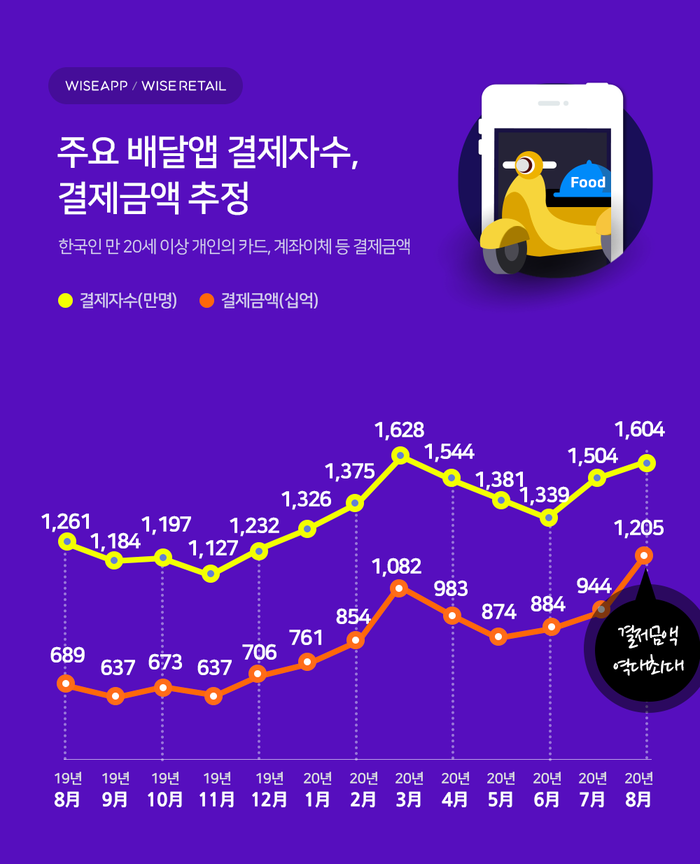 19일 앱 분석서비스 '와이즈 앱'에 따르면 지난 8월 기준 주요 배달앱(배달의민족, 요기요, 배달통, 푸드플라이)의 월 결제액은 1조2050억원이다. 전달(9440억원)보다 7.8% 늘어나, 사상최대 증가폭을 기록했다.
