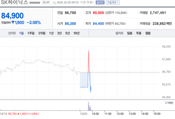20일 오전 9시 55분 현재 유가증권시장에서 SK하이닉스(000660)는 전 거래일(8만6700원)보다 2.08%(1800원) 하락한 8만4900원에 거래되고 있다. 이날 SK하이닉스는 장중 한때 4.84%(4200원) 오른 9만900원까지 오르기도 했지만 이내 하락반전하며 낙폭을 키웠다.