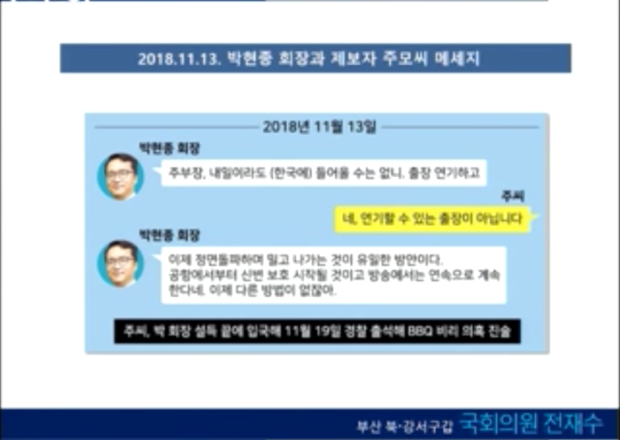 그러나 전 재수 의원은 제보자와 bhc 홍보팀장이 주고 받은 메시지, 박 회장 본인이 제보자와 주고 받은 메시지 등을 보여주며 박 회장의 주장에 반박했다.