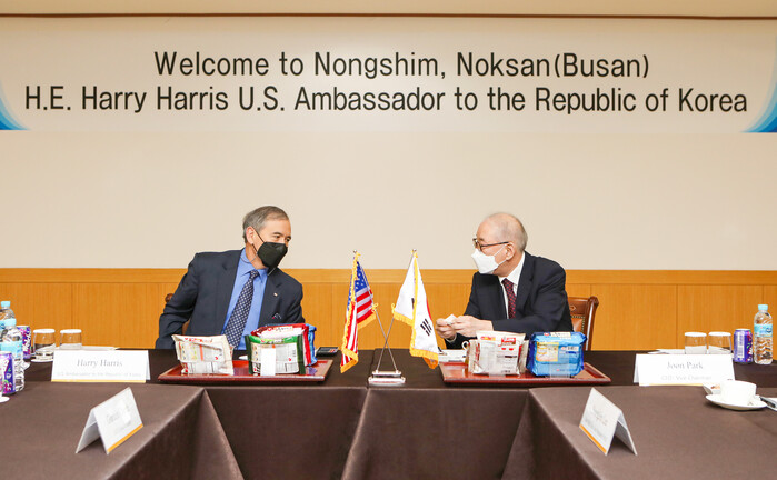 | ▲ 해리 해리스 주한미국대사는 23일 농심 녹산공장을 방문해 농심 박준 대표이사와 환담을 나눴다. 사진 왼쪽부터 해리스 주한미국대사와 농심 박준 대표이사(제공=농심) |