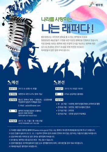 병무청(청장 박창명)은 병역이 자랑스러운 세상만들기 캠페인의 국민적 인지 제고 및 성과확산, 지속적인 관심 유발을 위해 공공기관으로서는 처음으로 '병역의무를 당당히 수행하는 당신이 진짜 히어로'라는 주제로 '나라를 사랑하는 나는 래퍼다!' UCC공모를 8월 6일(화)부터 9월 9일(월)까지 실시한다고 밝혔다.