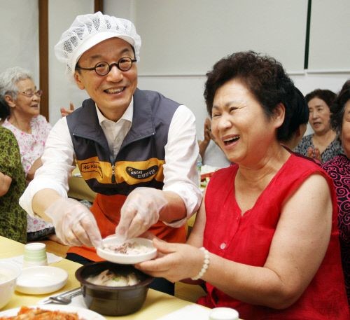 ▲ KB국민은행은 이건호 은행장(왼쪽)이 8일 종로구에 위치한 쪽방촌 할머니께 삼계탕을 전달하고 있다.