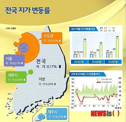 서울시는 0.21%로 작년 9월부터 11개월째 소폭의 상승세를 이어갔다. 특히 25개 자치구 모두에서 지가가 오른 것으로 집계됐다.