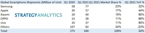 21일 시장조사업체 스트래티지애널리틱스(SA)에 따르면, 삼성전자는 올해 1분기 시장점유율 23%를 기록하며 1위를 탈환했다. 이 기간 삼성전자는 7700만대의 스마트폰을 판매했는데, 전년 동기(5800만대) 대비 32% 늘어난 물량이다.