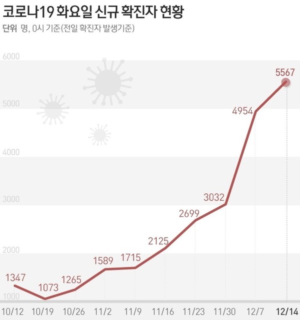 신규 확진자는 전일 5817명보다 250명 감소했지만, 월요일(발생기준) 역대 최다 규모다. 전주 월요일인 7일 0시 기준 신규 확진자 4954명보다는 613명 증가했다. 2주 전인 11월 30일 3032명과 비교하면 2535명 더 많이 발생했다. 지난 4주간 같은 요일 기준으로 2698명(11월23일)→3032명(11월30일)→4954명(12월7일)→5567명(12월14일) 등 매주 앞자리가 바뀌었다.