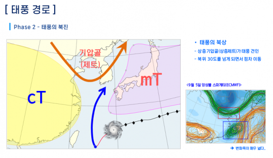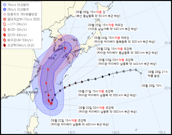 우진규 예보분석관은 "태풍의 규모가 우리나라를 뛰어넘는 수준이기 때문에 태풍 영역에는 큰 변화가 없고, 경로를 어디로 틀게 되더라도 우리나라에 큰 영향을 줄 가능성이 매우 크다"라며 "태풍이 우리나라로 북상하는 시점에도 중심기압이 915hPa 수준을 유지할 것으로 예상한다"라고 설명했다.