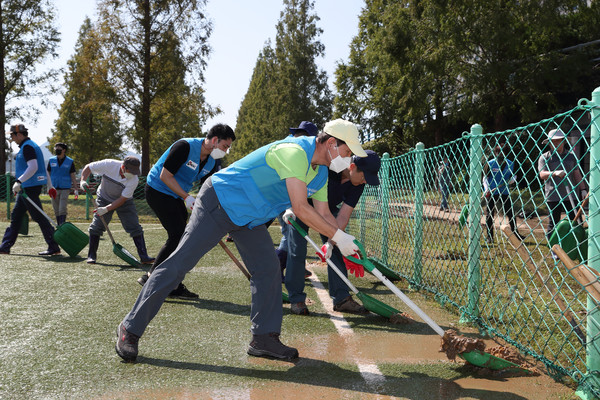 석유공사 임직원 100여명은 이날 오전과 오후로 조를 나누어 울산 태화강 주변에 모여 전날 태풍 힌남노로 인해 강 둔치로 밀려온 토사를 걷어내고 산책로와 야외 체육시설 내 진흙을 제거하는 등 태풍 피해복구 활동을 실시했다. ‘19년 국가정원으로 지정된 울산 태화강은 그 주변을 따라 약 20Km에 이르는 산책로와 다수의 생활체육시설, 대숲이 조성되어 있다. 이번 태풍 힌남노로 인해 태화강 주변 산책로가 불어난 물에 잠겼으며 다수의 토사와 쓰레기도 밀려들었다.