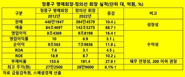 반면, 현대차의 지난해 영업이익률은 6.9%로, 2012년 10%를 추월하지는 못했다. 이는 정몽구 명예회장이 1000원치를 팔아 100원의 이익을 냈지만, 정의선 회장은 69원을 벌었다는 뜻이다.