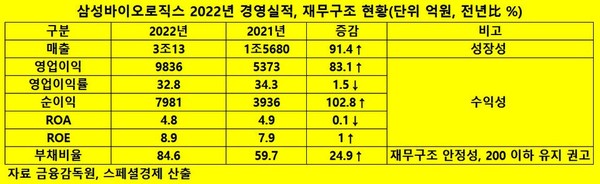 삼성바이오로직스의 지난해 부채비율은 84.6%로 전년보다 24.9% 상승했지만, 재무구조는 탄탄한 편이다. 자본의 타인의존도(차입경영)를 뜻하는 부채비율은 통상 200 이하 유지를 재계가 권장하고 있기 때문이다.
