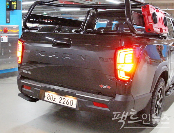 전면 대형 라디에이터 그릴과 바로 위 부조한 KAHN, 측면 사이드 스텝과 폭 265㎜, 편평비 60%인 오프로드 전용 타이어, 후면 데크에 음각한 KANH과 사륜구동을 뜻하는 빨간색의 4×4는 그대로다.