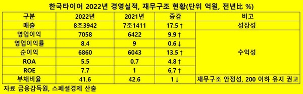 이에 따른 한국타이어의 지난해 ROA와 ROE는 각각 5.5%, 7.7%로 전년보다 0.7%포인트, 1%포인트 뛰었다.