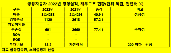 쌍용차의 지난해 순손실도 601억원으로 전년 손실(2660억원)보다 77.4% 개선했지만, 여전히 총자산순이익률(ROA)과 자기자본이익률(ROE)은 마이너스다. ROA와 ROE는 영업이익률과 함께 기업의 수익성 지표다.