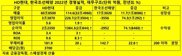 이에 따라 HD현대의 지난해 총자산순이익률(ROA)과 자기자본이익률(ROE)은 각각 3.4%, 9.6%로 전년보다 3%포인트, 8.3%포인트 상승했다. ROA와 ROE는 영업이익률과 함께 기업의 수익성 지표다.