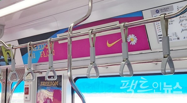 (위부터)서울지하철 2호선 객차안. 나이키가 랩핑 홍보를 진행하고 있다. 연인으로 보이는 승객이 나이키 농구화를 신었다. [영상=정수남 기자]