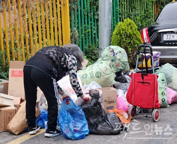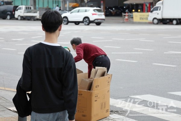 폐지나 고물 등을 주워 판매해 생계를 유지하는 노인이 전국에 1만5000명 정도다. (위부터)20대 청년이 성남시 산성대로에서 70대 노인의 폐지 수집 모습을 물끄러미 바라보고 있다. 인근 성남동중학교 옆에 사는 80대 노인이 고물을 수집하고 있다. 이 노인이 사는 집 앞에 주워 온 고물이 쌓였다. [사진=정수남 기자]